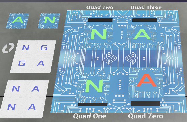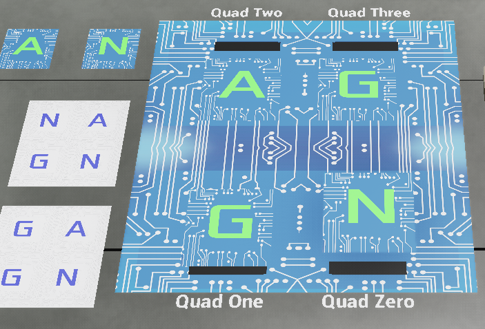 In GAN, when a card is moved from one quad to another, the card is flipped to its red side and that space becomes “locked”, as shown by the red ‘A’ in Quad Zero. Here, the player has matched his model card and won the round, but will miss out on collecting any of the cards in Quad Zero.